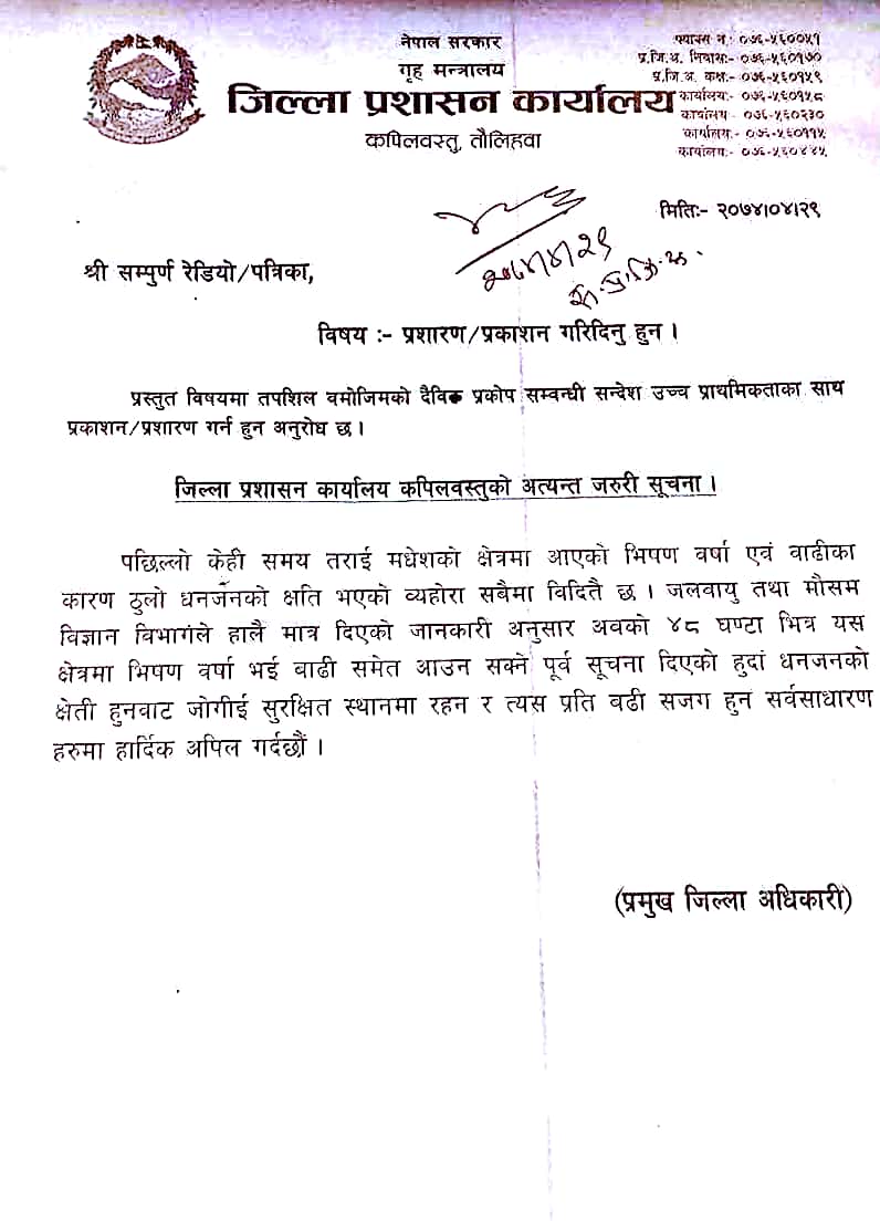 प्रमुख जिल्ला अधिकारी विष्णु प्रसाद ढकालद्धारा हस्ताक्षरित विज्ञप्तिमा भनिएको छ, जलवायु तथा मौसम विज्ञान विभागले हालै मात्र दिएको जानकारी अनुसार ४८ घण्टा भित्र यस क्षेत्रमा भिषण बर्षा भई बाढी पनि आउन सक्ने पुर्व सुचना दिएको हुँदा सम्भावित क्षतिबाट बच्न सबैमा अनुरोध गरिन्छ ।