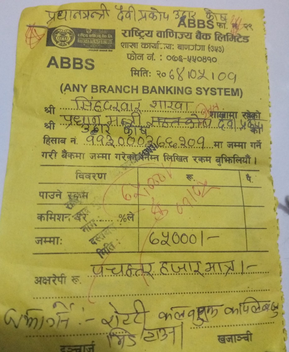 राहत कोषमा जम्मा गरिएको भौचर बुझदै प्रजिअ बिष्णु ढकालले रोटरी क्लवलाई धन्यबाद दिदै बाढी पीडितका लागि सबैले सक्दो सहयोग गर्न अपील गर्नु भएको छ ।