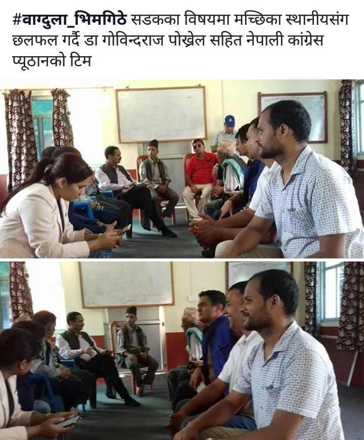 नेपाली कांग्रेस प्यूठानले सिइओ पोख्रेल दशैँमा आफन्त भेट्न आएको भनेर विज्ञप्ती निकालेपनि उनी पार्टीको प्रचारप्रसारमा लागेको प्रष्ट देख्न सकिन्छ । सामाजिक सञ्जाल फेसबुक) मा उनै पोख्रेलले कांग्रेसका नेता, कार्यकर्ताहरुसँगको भेटघाट, छलफलमा खिचेका फोटाहरु पोष्ट गरेका छन् । उनका फोटोहरु देख्दा लाग्छ, यतिबेला भूकम्पपीडितहरुले उनलाई गिज्जाईरहेका होलान् ।