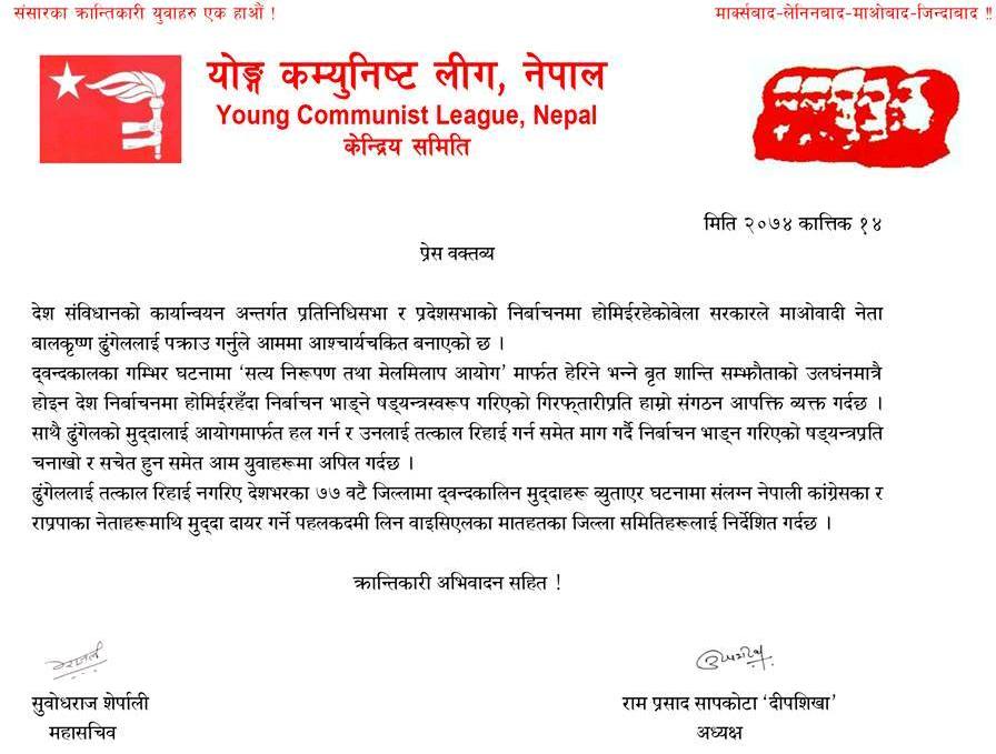 माओवादी केन्द्रको भातृ संगठन योङ कम्युनिष्ट लिग (वाइसिएल) ले पक्राउ परेका नेता बालकृष्ण ढुंगेललाई तत्काल रिहा गर्न माग गरेको छ।