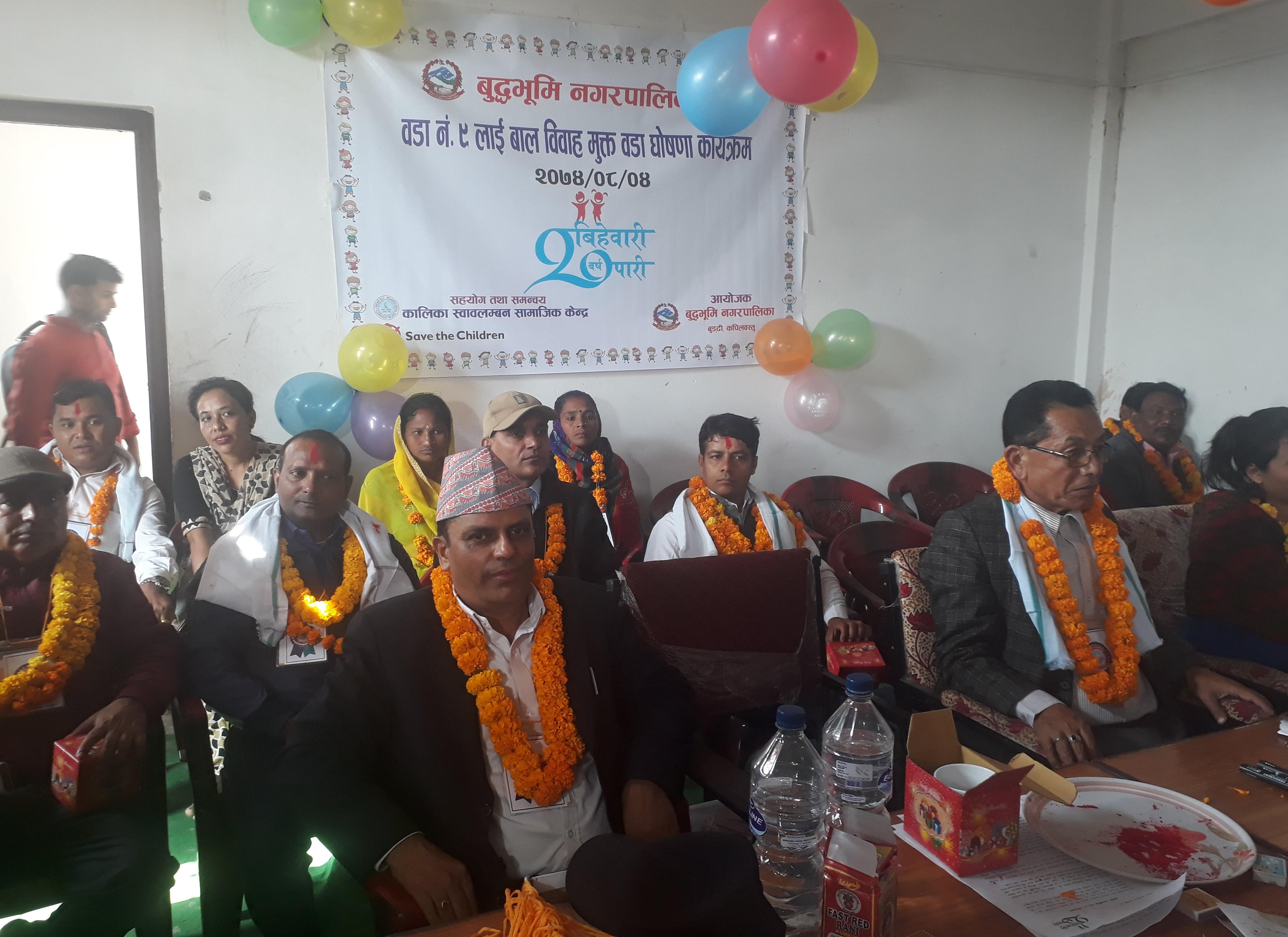 बुद्धभुमि नगरपालिकाको आयोजना तथा सेभ द चिल्डेनको सहयोग तथा सनसाईन सामाजिक संस्थाको सहयोगमा वडा न ४ र ५ तथा कालिका सामाजिक विकास संस्थाको सकृयतामा वडा न ९ मा बालविवाह मुक्त वडा घोषणा गरिएको हो ।