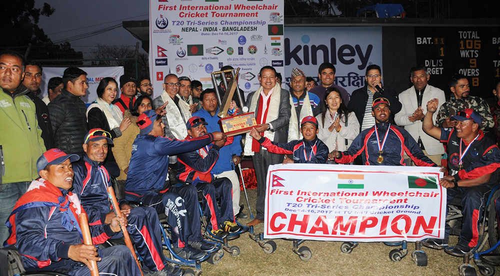 नेपालले अन्तर्रा्ष्ट्रिय टी ट्वेन्टी त्रिदेशीय ह्विल चेयर क्रिकेट प्रतियोगिताको उपाधि जितेको छ । आज भएको फाइनलमा बंगलादेशलाई ५४ रनले हराउँदै नेपालले उपाधि जितेको हो । नेपालले दिएको १ सय ६१ रनको लक्ष्य पछ्याएको बंगलादेश १८ ओभर २ बलमा १ सय ६ रनमा अलआउट भयो ।