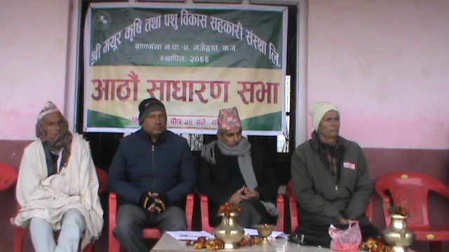 मयूर कृषि तथा पशु विकास सहकारी संस्था लिमिटेड बाणगंगा नगरपालिका ४ गजेहडाको आठौं साधारणसभा सम्पन्न भएको छ । साधारण सभामा लेखा समिती संयोजक बिष्णु प्रसाद अर्यालले गत आर्थिक बर्ष ०७३÷०७४ को १ करोड १० लाख ५ हजार २ सय ४१ बराबरको आय व्यय प्रस्तुत गर्नुभयो । भने ०७४÷०७५ को १३ लाख ९५ हजार बराबरकोे अनुमानित लक्ष प्रस्तुत गर्नुभयो ।