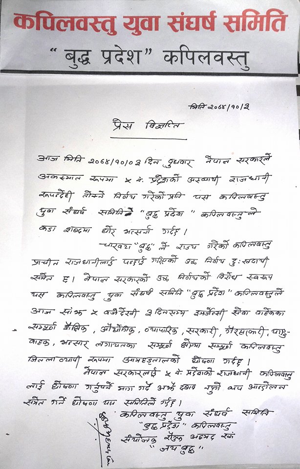 चारवटा ‘बुद्ध’ले राज्य गरेको कपिलवस्तु प्राचिन राजधानीलाई पन्छाई सरकारले बुधबार गरेको उक्त निर्णय प्रति आफुहरु दुखी भएको संघर्ष समितिका संयोजक रउफ अहमद खाँनले बताउनुभयो । सरकारले तत्काल प्रदेश राजधानी कपिलवस्तुलाई नबनाए अझै सशक्त आन्दोलन चर्काउने संघर्ष समितिका सहसंयोजक दीपक पाण्डेयले चेतावनी दिनुभयो ।