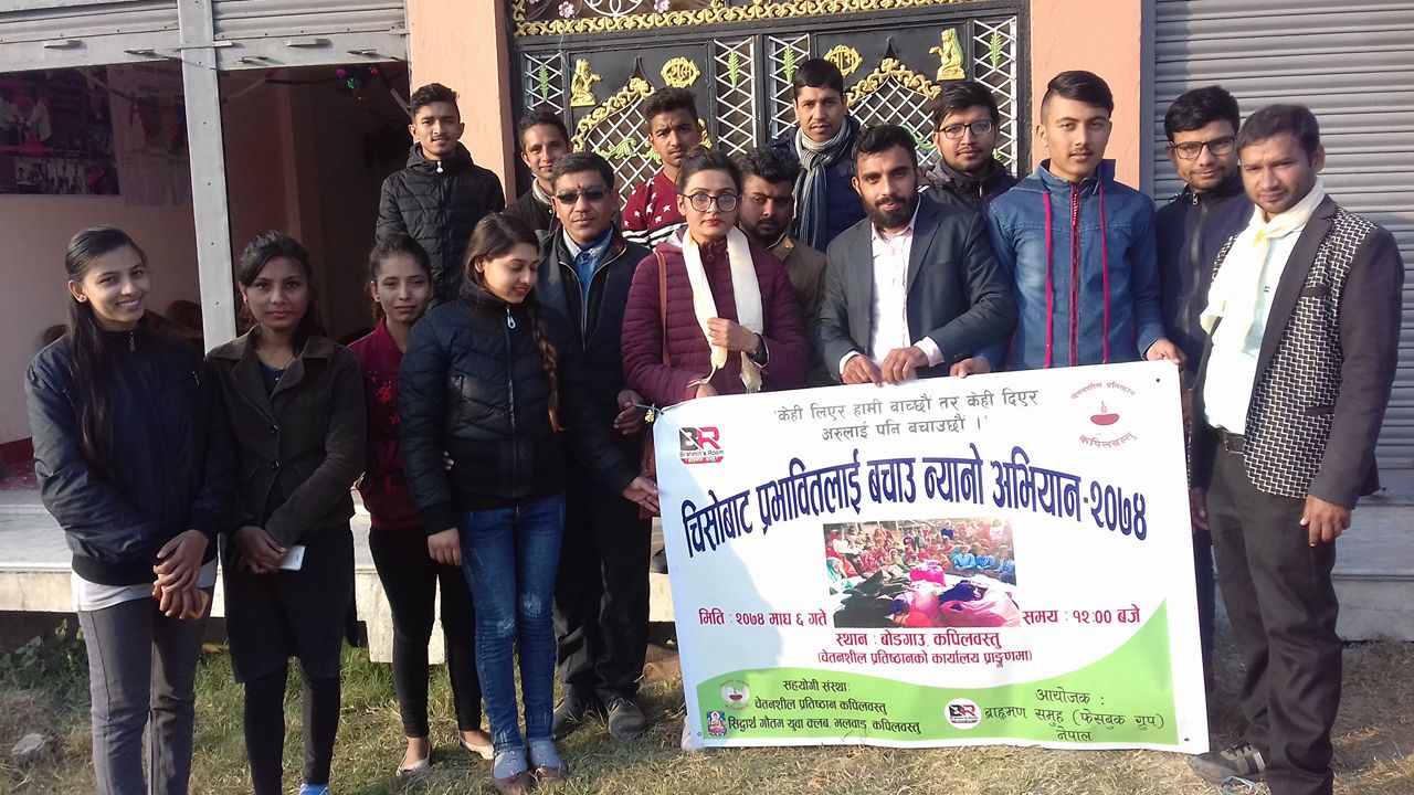 फेसबुक ग्रुप ब्रामण समाज नेपालको मुख्य सक्रियतामा कपिलवस्तुमा रहेका चेतनसील प्रतिष्ठान र सिद्धार्थ गौतम युवा क्लवको संयुक्त आयोजनामा बाणगंगा नगरपालिका भित्र रहेका अति बिपन्न तथा गरिब घर परिवारका ५० भन्दा बढि बृद्धबृद्धा तथा बालबालिकालाई न्यानो कपडा बितरण गरिएको छ ।