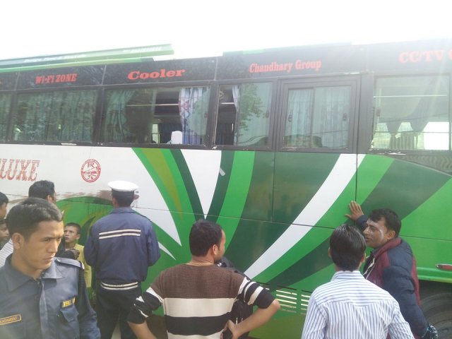 तस्विर ः अज्ञात समूहले बम प्रहार गरेको बस ।