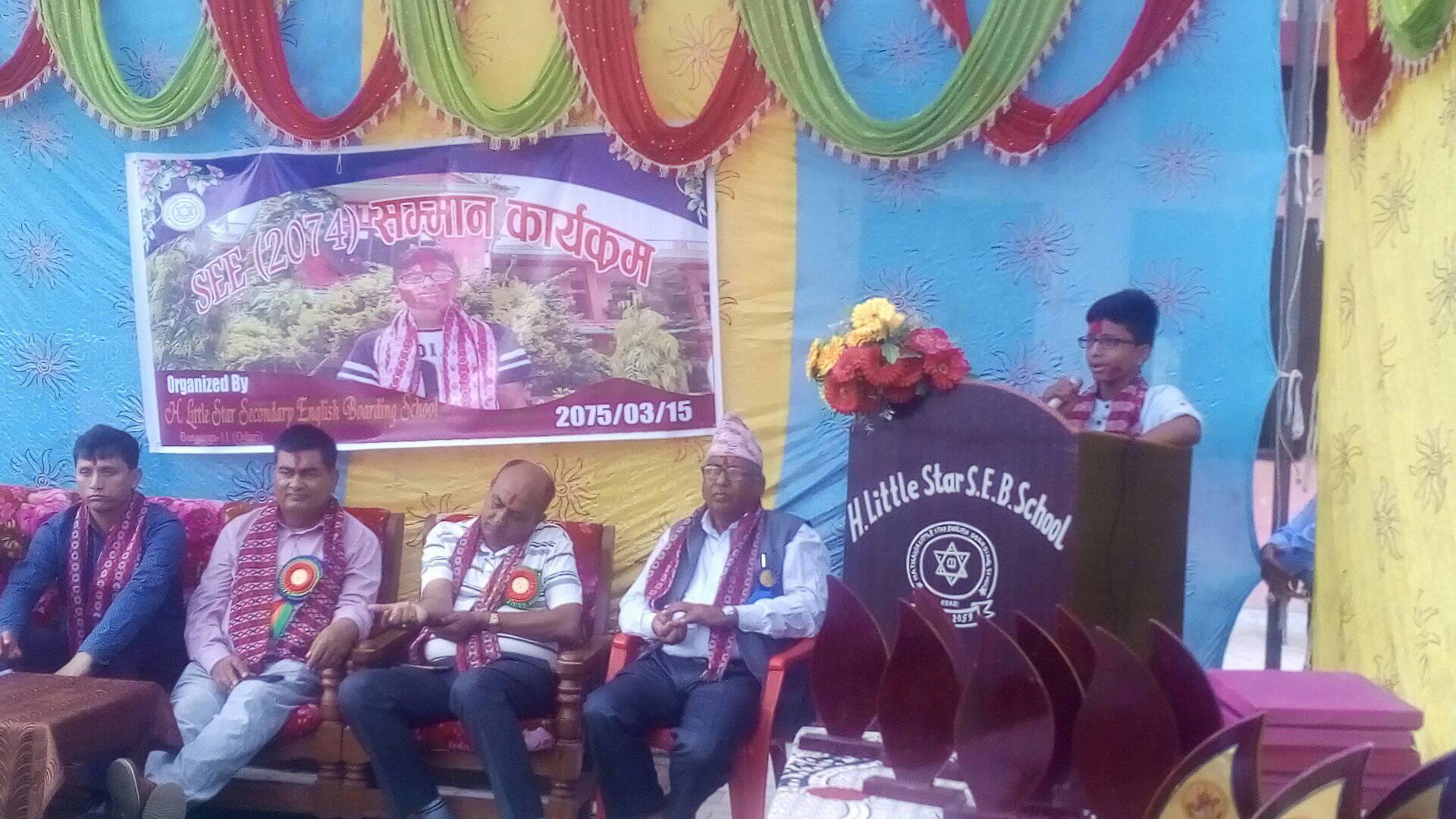 लिटिल स्टार ईंलिस बोर्डिङ हथौसाले एसईई परिक्षामा जिल्ला प्रथम हुने नारायण खनाल सहित उत्कृष्ट जिपिए ल्याउने विद्यार्थीलाई सम्मान गरेको छ । कार्यक्रममा बोल्दै जिल्ला शिक्षा समन्वय ईकाई समिती प्रमुख सुरेन्द्रराज पराजुलीले संस्थागत विद्यालयको नतिजा राम्रो आएको बताउनुभयो उहाले लिटिल स्टारको नतिजाले जिल्लाको गरिमा उच्च राख्न सफल भएको भन्दै प्रशंसा गर्नुभयो ।