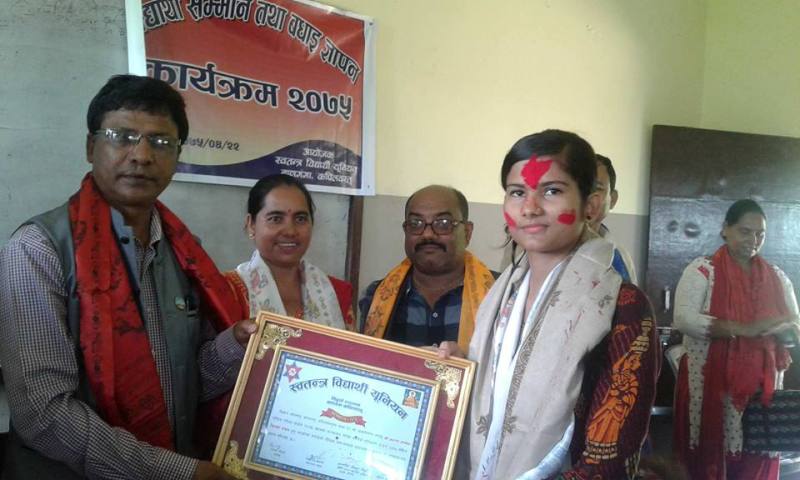 कार्यक्रममा जिल्ला प्रथम अरुणा अर्याल सहित द्धितीय र तृतीय स्थान हासिल गर्ने राजन बेल्बासे, सविना अर्याल लगायत उत्तीर्ण सम्पुर्ण विद्यार्थीलाई प्रमाण प्रत्रद्धारा सम्मान गरिएको थियो ।
