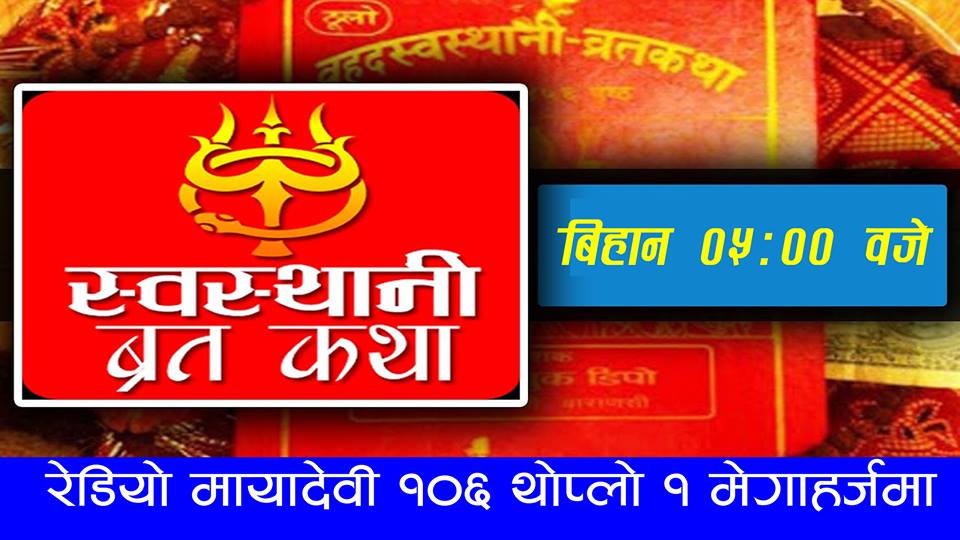 कपिलवस्तुको बाणगंगाा ४ जितपुरमा रहेको रेडियो मायादेवी १०६ थोप्लो १ मेगाहर्जले पनि सोमबारबाट श्रीस्वस्थानी ब्रतकथाको कथाबाचन सुरु गरेको छ । अबदेखि हरेक दिन विहान ५ बजेदेखि साढे ५ बजेसम्म दैनिक रुपमा स्वस्थानी व्रत कथा बाचन गरिने रेडियोका स्टेशन म्यानेजर चन्द्रकान्त न्यौपानेले बताउनुभयो ।