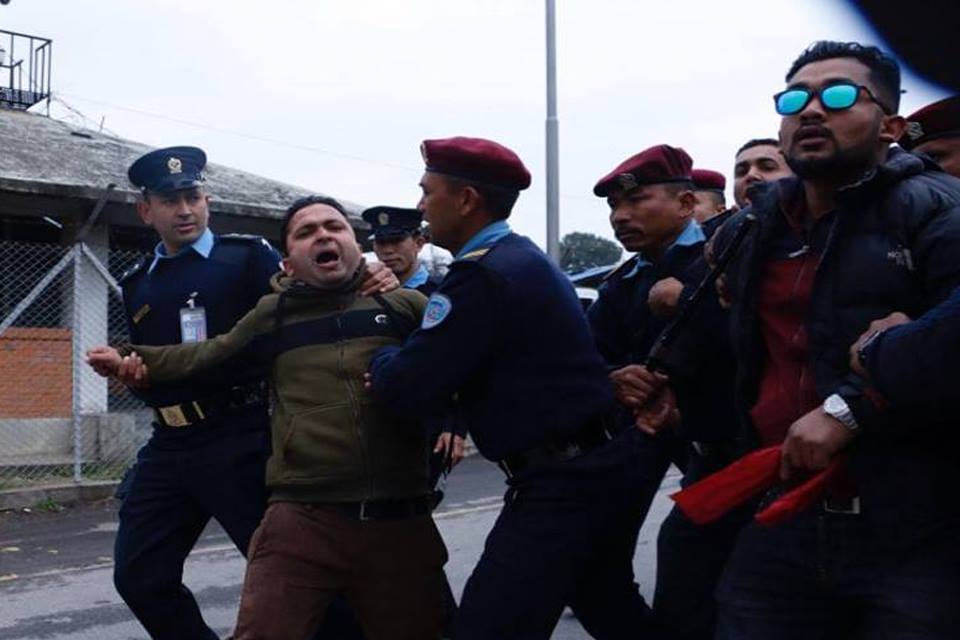 प्रधानमन्त्री केपी शर्मा ओलीलाई त्रिभुवन अन्तराष्ट्रिय विमानस्थलभित्रै कालो झण्डा देखाइएको छ । स्वीट्जरल्याण्डमा विश्व आर्थिक मञ्चको ४९ औँ बैठकमा सहभागी भई स्वदेश फर्केका ओलीलाई विमानस्थलको सुरक्षा जाँच कक्षमै कालो झण्डा देखाइएको हो । प्रहरीले कालो झण्डा देखाउने नेपाल विद्यार्थी संघका केही युवालाई पक्राउ गरेको छ । पक्राउ पर्नेमा शुसिल भट्ट, निरन्जन थापा, सुदीप अधिकारी, सुवास घिमिरे लगायत छन् ।