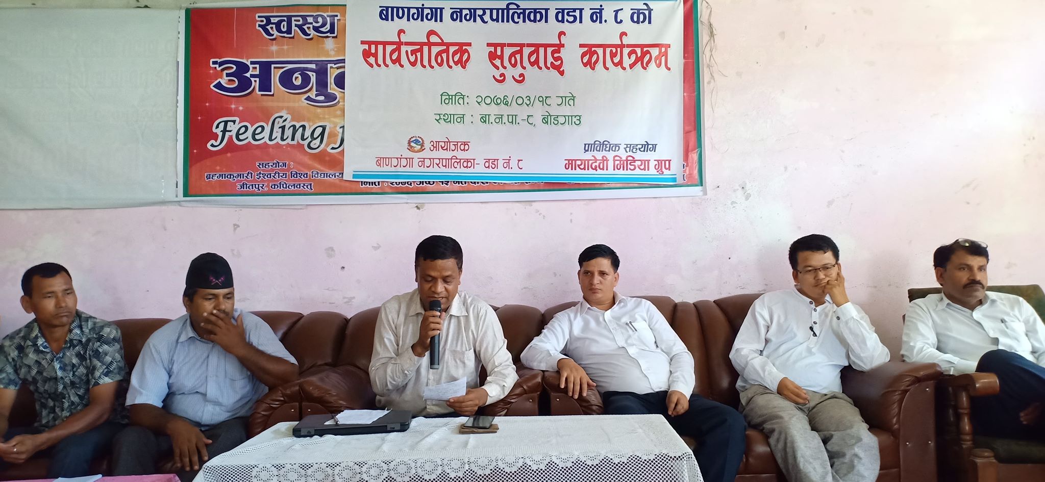 कपिलवस्तुको वाणगंगा नगरपालिका वडा नं. ८ का वडाबासीले वडा अध्यक्षको खुलेरै प्रशंसा गरेका छन् । वडा कार्यालयले दिने सेवा प्रवाह देखि विकास निर्माणका काममा आफुहरु सन्तुष्ट रहेको वडाबासीले बताए । वडा कार्यालयको आयोजना तथा मायादेवी मिडिया ग्रुप प्रालिको प्राविधिक सहयोगमा बुधबार भएको सार्वजनिक सुनुवाई कार्यक्रममा बोल्ने अधिकांश बक्ताले वडाध्यक्षको काम प्रति प्रशंसा गर्दै सुझाव सहितको प्रश्न राखेका थिए ।