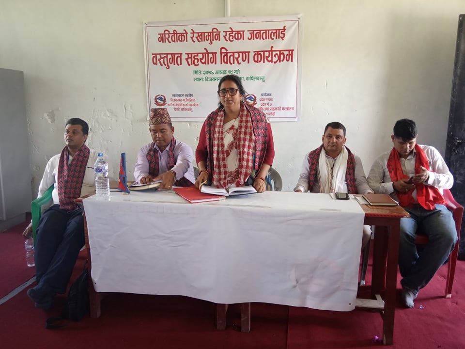 कृषि, पशुपंक्षी, सहकारी तथा भुमिसुधार मन्त्रालय महाशाखा प्रमुख प्रदीप शर्माले कार्यक्रमको बारेमा जानकारी गराउँदै प्रदेश नं. ५ भित्र रहेका १२ जिल्लामा अति गरिब चार जिल्ला मध्ये कपिलवस्तु पनि गरिबीको रेखामुनि रहेको बताउनुभयो । त्यसमा पनि कपिलवस्तुको विजयनगर अति गरिबी रेखामुनि रहेको बताउनुभयो । गरिबीको रेखामुनि रहेका ४० जना कृषकहरुलाई वस्तुगत सहयोग गरिएको उहाँले बताउनुभयो । कार्यक्रमले किसानलाई उत्पे्ररणा दिई आत्मनिर्भर बनाउने बताउनुभयो ।