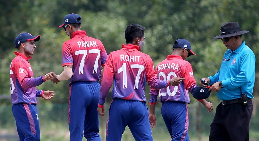 नेपालका लागि ओपनर पवन सरार्फ ४५ रनमा आउट भए । १५ औं ओभरको चौथो बलमा भिनित चितेश मेहता क्याच गराउँनु अघि पवनले ४१ बलमा १० चौका प्रहार गरे । पवन र रितले पहिलो विकेटका लागि ९२ रनको साझेदारी गर्दै राम्रो सुरुवात दिलाएका थिए । कप्तान रोहित कुमार पौडेल भने ७ रनमा क्याच आउट हुन पुगे ।डेब्यू गरेका विशाल बिक्रम केसी भने १ रनमा बोल्ड आउट भए । सिंगापुरका लागि प्रनव सुदर्शन राजेश कृष्णन र भिनित चितेश मेहताले समान २ विकेट हात पारे ।