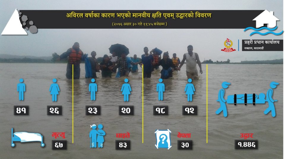 १ ४४५ जनाको सकुशल उद्धार बाढी पहिरोमा परेका काठमाडौंमा २ सय ८५ जना, ललितपुरमा ६१ जना, उदयपुर १० जना, रौतहटमा २ सय जना, महोत्तरीमा ५ सय जना, सिराहामा २ जना, सर्लाहीमा १ सय जना, सप्तरीमा २५ जना, सिन्धुलीमा ७० जना, धादिङमा १७ जना, चितवन १ सय ७० जना तथा भक्तपुर, सुनसरी, मकवानपुर, खोटाङ र डोल्पामा १-१ जना गरी जम्मा १ हजार ४ सय ४५ जनालाई सकुशल उद्दार गरी सुरक्षित स्थानमा स्थानान्तरण गरिएको छ। अझै १४ महिला १८ पुरुष जना वेपत्ता बाढी पहिरोमा परी डोल्पामा ९ जना, सिन्धुलीमा ४ जना, ईलाम र मोरङमा ३र३ जना, महोत्तरी र मकवानपुरमा २-२ जना तथा काठमाडौं, ललितपुर, झापा, सुनसरी, पर्सा, रौतहट, धनुषा, धादिङ र दाङमा १र१ जना गरी ३२ जना वेपत्ता भएका छन् ।