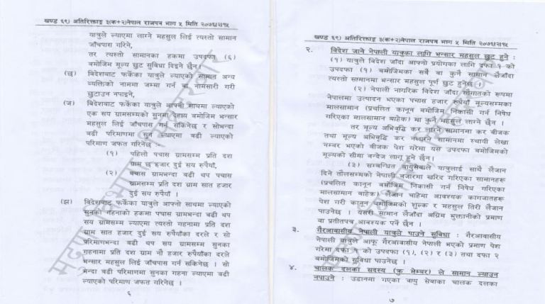 यसैगरी नेपाली नागरिकको विदेश बसाईमा मृत्यु भएको भन्ने प्रमाणित भए निज र निजको परिवारका पुराना सबै किसिमका सामान स्वदेश ल्याउँदा पूर्ण भन्सार छुट हुने व्यवस्था गरेको छ ।