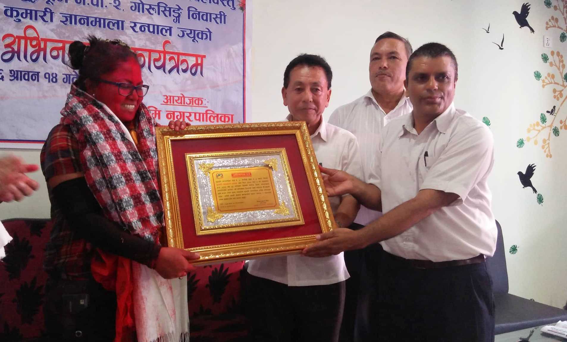 कपिलवस्तुको बुद्धभूमि नगरपालिकाले दलित समुदायबाट सगरमाथामा पहिलो पटक सगरमाथा ओरोहण गरेकी ज्ञानमाला रन्पाललार्ई अभिनन्दन गरेको छ । गोरुसिंगेमा सोमबार राखिएको अभिनन्दन कार्यक्रममा नगरपालिका– २ गोरुसिंगेकी रन्पाललाई खादा, दोसल्ला र कदर पत्रले सम्मानित गरिएको हो ।