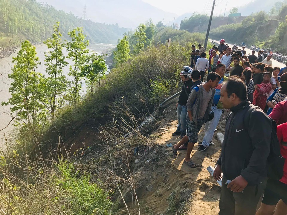 सर्लाहीबाट काठमाडौँ आउँदै गरेको बस त्रिशूली नदीमा खस्दा मृतक पाँच जनाको शव भेटिएको छ । दुर्घटनामा घाइते भएका १६ जनालाई उद्धार गरेर अस्पताल लगिएको छ । बसमा सवार मध्ये २४ जना अझै बेपत्ता रहेका प्रहरीले जनाएको छ । उनीहरुको खोजी भइरहेको छ । नदीमा खसेको बसलाई क्रेनमार्फत बाहिर निकालिएको छ ।सर्लाहीको मलङ्गवाबाट काठमाडौँ आउँदै गरेको ना ६ ७४६९ नम्बरको यात्रुवाहक बस शुक्रबार बिहान ३ बजे त्रिशूली नदीमा खसेको हो ।