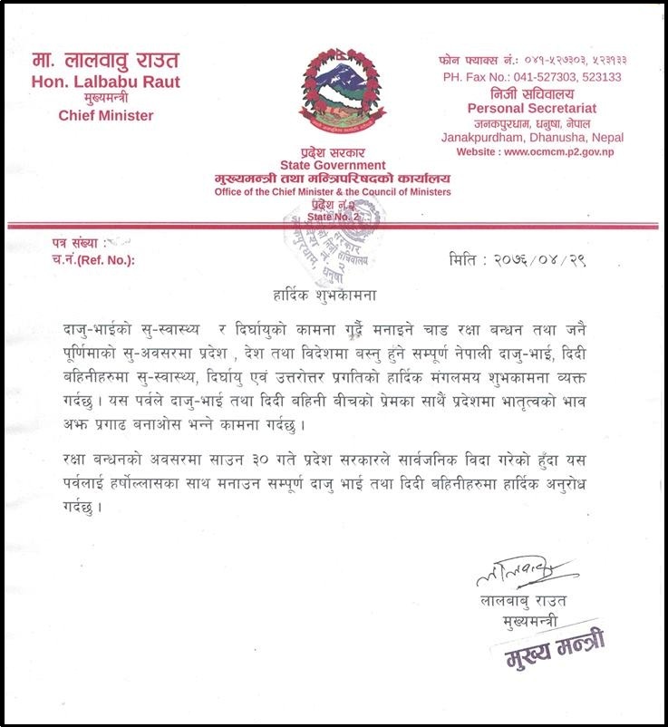 प्रदेश २ का मुख्यमन्त्री लालबाबु राउतले जारी गर्नु भएको शुभकामना सन्देशमा लेखिएको छ, ‘रक्षाबन्धन पर्वको अवसरमा साउन ३० गते प्रदेश सरकारले सार्वजनिक बिदा दिने निर्णय गरेको हुँदा यस पर्वलाई हर्षोल्लासका साथ मनाउन सम्पूर्ण दाजुभाइ तथा दिदीबहिनीमा हार्दिक अनुरोध गर्दछु ।’