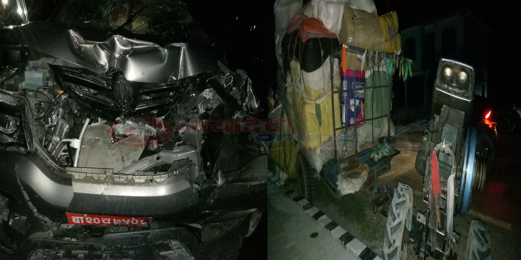 बाणगंगा नगरपालिकामा वडा नम्बर ४ स्थित ठाकुरापुरमा कार र ट्याक्टर दुर्घटना हुँदा २ जन घाइते भएका छन् । चार नम्बरबाट गजेहडातर्फ जाँदै गरेको ट्याक्टरलाई समान दिसाबाट गुडिरहेको बा २० च ७५०८ कारले ठक्कर दिँदा २ जना घाइते भएका हुन् । यसरी घाइते हुनेमा कारका चालक बाणगंगा जितपुर निवासी मान बहादुर नेपाली र सिउटी निवासी ट्याक्टर चालक दिपक चौधरी रहेका छन् । चौधरीको टाउकोमा चोट लागेको छ भने नेपालीलाई सामान्य चोट लागेको इलाका प्रहरी कार्यालय पिपराले जानकारी दिएको छ । कपिलवस्तु सामुदायिक अस्पत्तालमा सामान्य उपचारपछि उनीहरुलाई बुटवल रिफर गरिएको छ । ट्रयाक्टरको भने नम्बर खुलेको छैन ।कार चालकको असावधानी र लापरबाहीका कारण दुर्घटना भएको प्रहरीको भनाई छ ।कारको अगाडीको भाग सबै फुटेको छ । ट्याक्टर पनि ओभर लोडमा रहेका कारण कारको ठक्करपछि नियन्त्रण बाहिर गएर सडकको बायाँ छेउमा उछिट्टिएको प्रत्यक्षदर्शीले बताएका छन् । ट्याक्टरमा लोड भएका सामानहरु केही सडकमा खसेका छन् ।