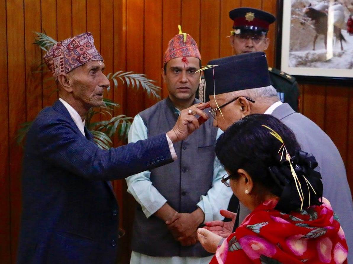 यो वर्ष आज मात्र टीका लगाइदिने उहाँले बताउनुभयो । पूर्वप्रधानमन्त्री एवं समाजवादी पार्टीका संघीय परिषद अध्यक्ष डाक्टर बाबुराम भट्टराईले ९० वर्षीय बुवा भोजप्रसाद भट्टराईको हातबाट टीका लगाउनुभएको छ ।