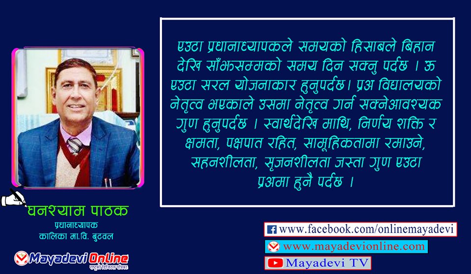 विद्यालय र प्रधानाध्यापक एक अर्काेको पुरक हुन् । जहाँ विद्यालय हुन्छ, त्यहाँ प्रधानाध्यापक अवश्य हुन्छ । प्रधानाध्यापक विहीन विद्यालय हुन सक्दैन । तर विद्यालयको दृष्टिकोण, लक्ष्य र योजनाले विद्यालयलाई एउटा प्रधानाध्यापकको नेतृत्वमा वि.व्य. स., शि. अ. क. र शिक्षक कर्मचारीले चाहे अनुसारको सुधार ल्याउन सकिन्छ भन्ने कुरा व्यवहारिक रुपमा कालिका मानविज्ञान मावि ले प्रमाणित गरेको छ ।