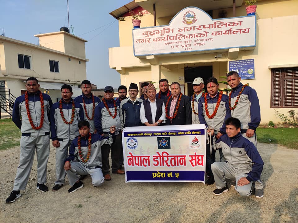 प्रदेश नं. १ को सुनसरीमा आयोजित डोरीतान च्याम्पियनसिप प्रतियोगितामा सहभागी खेलाडीलाई विदाई गरिएको छ । प्रदेश ५ बाट प्रतिनिधित्व गरी सुनसरी हिडेका खेलाडीलाई बुद्धभूमि नगरपालिकाका नगर प्रमुख केशव कुमार श्रेष्ठले विहीबार विहान विदाई गर्नुभएको हो ।