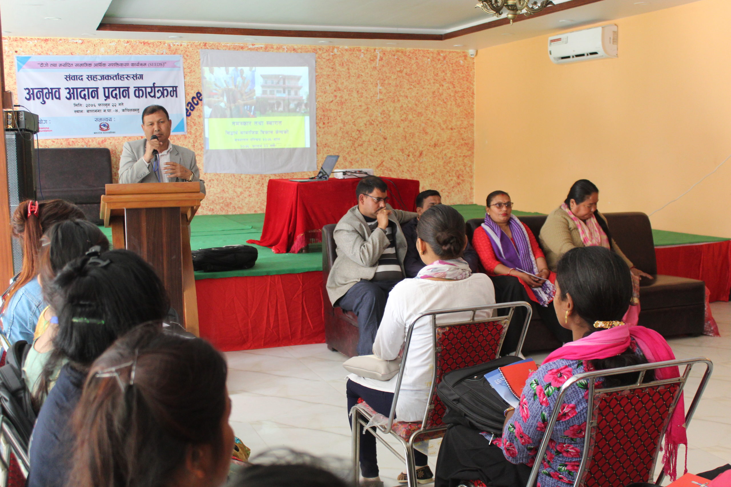 कार्यक्रममा वोल्दै सिदार्थ सामाजिक विकास केन्द्रका अध्यक्ष तेजप्रसाद आचार्यले समुदायमा एक्लै काम गर्न गाहो हुने कुरा वताउँदै सवैसंग सहकार्य गरेर अगाडि वढिरहेको वताउनु भयो । संस्थाका सचिव रोमकान्त घिमिरेले संस्थागत जानकारी गर्नु भएको कार्यक्रममा सिड्स कार्यक्रमका फोकल पर्शन प्रकाश घिमिरेको स्वागत मन्तव्य रहेकोे थियो भने सिड्स कार्यक्रमको बारेमा कार्यक्रम संयोजक आर टि खानले जानकारी गराउनु भएको थियो ।