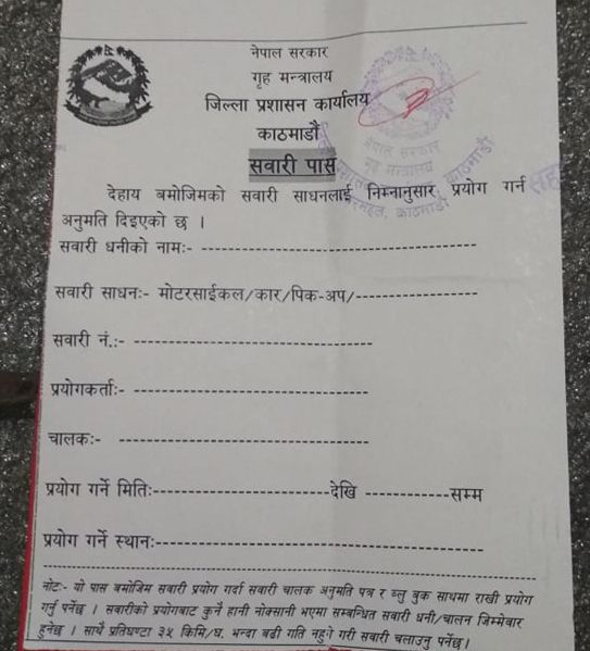 काठमाडौंका सहायक प्रमुख जिल्ला अधिकारी जीवन आचार्यले सूचना विभागबाट जारी भएका र प्रशासनबाट अनुमतिपत्र लिएका सञ्चार माध्यमका सवारी साधनलाई कुनै रोकतोक नहुने बताए। सोमबार साँझ सरकारले ११ गतेदेखि लागू हुने गरी देशभर लकडाउन गर्ने निर्णय गरेपछि गृह मन्त्रालयले पास वितरण गर्न काठमाडौंसहित देशभरका प्रशासन कार्यालयलाई परिपत्र गरेको थियो।