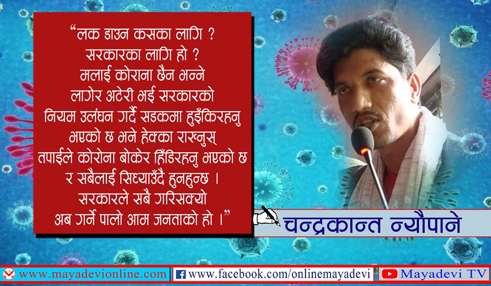मेरो प्रश्न छ कि ? लकडाउन कसको लागि हो ? नागरिकको लागि कि सरकारको लागि ? नागरिकको लागि हो भने किन हामी जानीजानी ठाडो उलङ्घन गरिरहेका छौँ । यदि सरकारको लागि हो भने तपाईले नियम मान्नै पर्दैन । जे मन लाग्छ त्यही गर्नुस् । तपाईलाई थाहा छ कोरोनाको रुप कस्तो छ ? संसारभरको कुनै तागतले रोकथाम गर्न नसकेको कोरोना नेपालमा फैलियो तपाईले कल्पना गर्न सक्नु हुन्छ यसले नेपालमा कुन रुप लेला ? अहिलेसम्म करिब २ सय मुलुक यस रोगबाट प्रताडित छन् । हाम्रो देशमा हरियो वत्ति निभेर कोरोनाको रातो बत्ति बलिसकेको छ ।