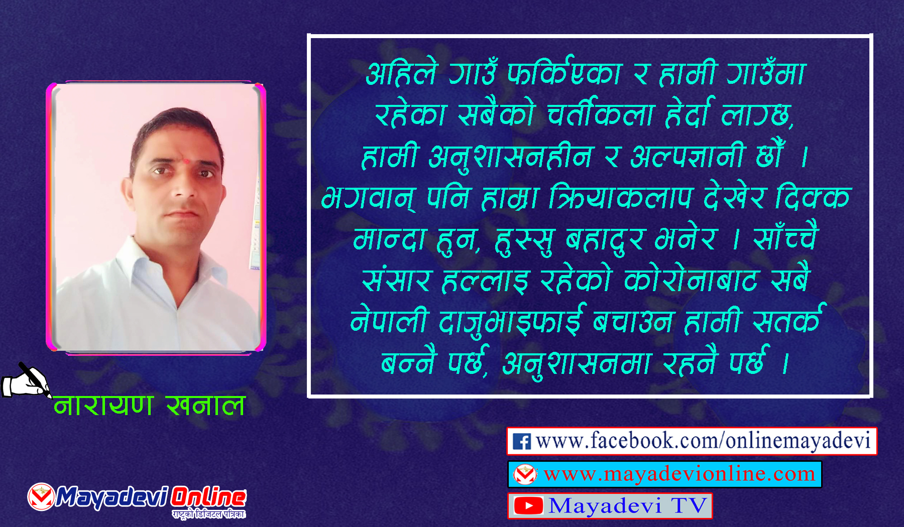 अहिले गाउँ फर्किएका र हामी गाउँमा रहेका सबैको चर्तीकला हेर्दा लाग्छ, हामी अनुशासनहीन र अल्पज्ञानी छौँ । भगवान् पनि हाम्रा क्रियाकलाप देखेर दिक्क मान्दा हुन, हुस्सु बहादुर भनेर । साँच्चै संसार हल्लाइ रहेको कोरोनाबाट सबै नेपाली दाजुभाइफाई बचाउन हामी सतर्क बन्नै पर्छ, अनुशासनमा रहनै पर्छ । हाम्रा आफ्नै क्रियाकलापले कोरोना स्वागतमा हामी आफै आतुर रहेको प्रमाण बन्नुहुन्न । हामी सुध्रिनु पर्छ, समाजलाई धैर्य रहन सम्झाउनु पर्छ, नेपाली नागरिकको परिचय नै यही हो, धर्म नै यही हो, आफू बाँच्ने र अरुलाई पनि बचाउने, यसलाई हामीले मर्न दिनुहुन्न । अहिलेका हाम्रा क्रियाकलापले त भनिरहेको छ कतै, हामी आफै कोरोनाको स्वागतमा आतुर त छैनौं ?