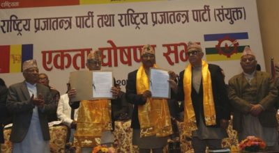 काठमाडौं । राप्रपा र राप्रपा (संयुक्त) बीच एकीकरण भएको छ । राष्ट्रिय सभागृहमा बुधबार आयोजित