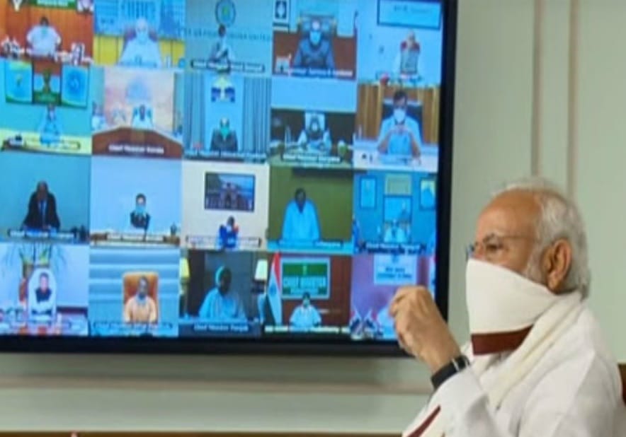 यता, प्रधानमन्त्री मोदीले शनिबार विभिन्न राज्यका मुख्यमन्त्रीहरुसँगको भिडियो कन्फरेन्समा २१ दिनपछि तेस्रो बैठक बसेर छलफल गरेका छन्। बैठकमा मोदीले लगाएको आफ्नो गमछालाई नै मास्क बनाएका थिए।