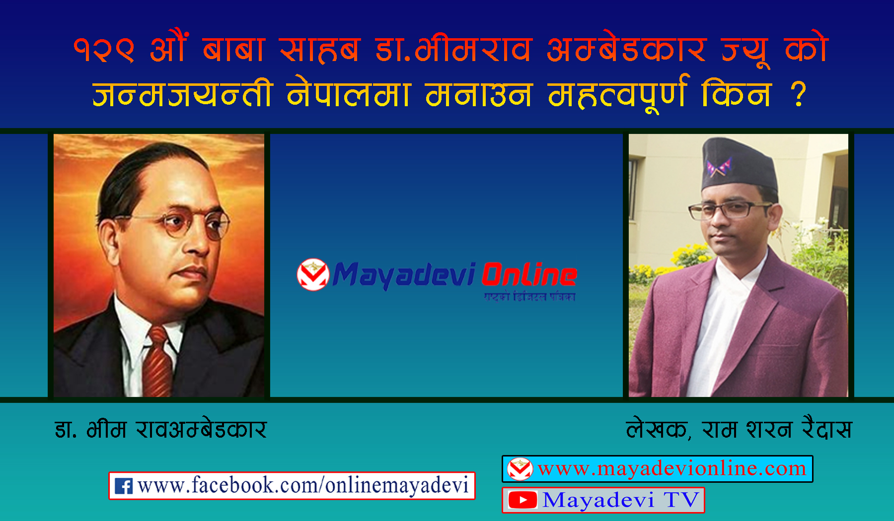 बाबा साहब डा. भीम राव अम्बेडकार ज्यूको जन्म आज देखि १२८ बर्ष पहिला १४ अप्रैल १८९१ मा वर्तमान मध्य प्रदेश इन्दौरको महु छावनीमा जन्म भएको थियो । वहाँ एक संसारका लागी सिम्बल अफ नलेज, मानवतावादी, महानदेश भारतका संविधान निर्माता, दलित गरिब, गरिब शोषित पिडित तथा महिलाहरुका लागी मसिहा हुनु हुन्थ्यो ।