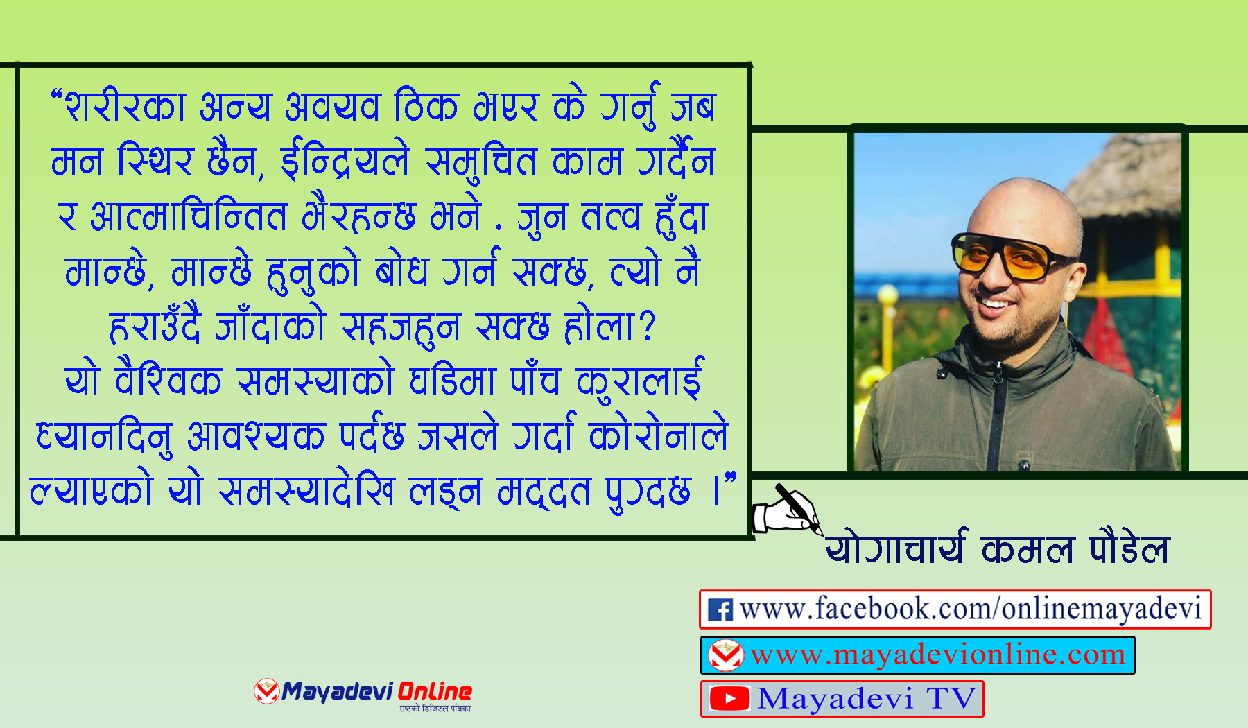 अर्थात्, शरीर भित्रका त्रिदोषहरु, अग्निहरु, धातुहरुको समावस्था, मल आदि क्रिया निरन्तर हुनु र शरीरभित्र स्थित आत्मा, ईन्द्रिय र मन प्रशन्न भएको अवस्था नै स्वास्थ्य हो । अहिलेको वर्तमान अवस्थामा आत्मा, ईन्द्रिय र मन विचलित छ । मान्छेहरु कोरोनाको डरले त्राही–त्राही भएका छन् । दिनप्रतिदिन संक्रमण हुनेको संख्या र मर्नेको संख्या बृद्धि भैरहेको छ । विशेष गरेर आत्मबल कमजोर हुने, रोगप्रतिरोधात्मक क्षमता कम हुने र बुढापाकाहरुका लागि निकै नै डरको अवस्था सिर्जना भएको छ । उत्साह दिनप्रतिदिन घट्दै गैरहेको छ । विहान साँझ आउने समाचारले मान्छेहरुलाई शसंकित बनाइरहेको छ ।