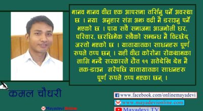 कमल चौधरी । विश्वभरी महामारीको रूपमा फैलिएको कोरोना भाइरस (कोभिड–१९) ले यतिबेला विश्व समुदायलाई नै
