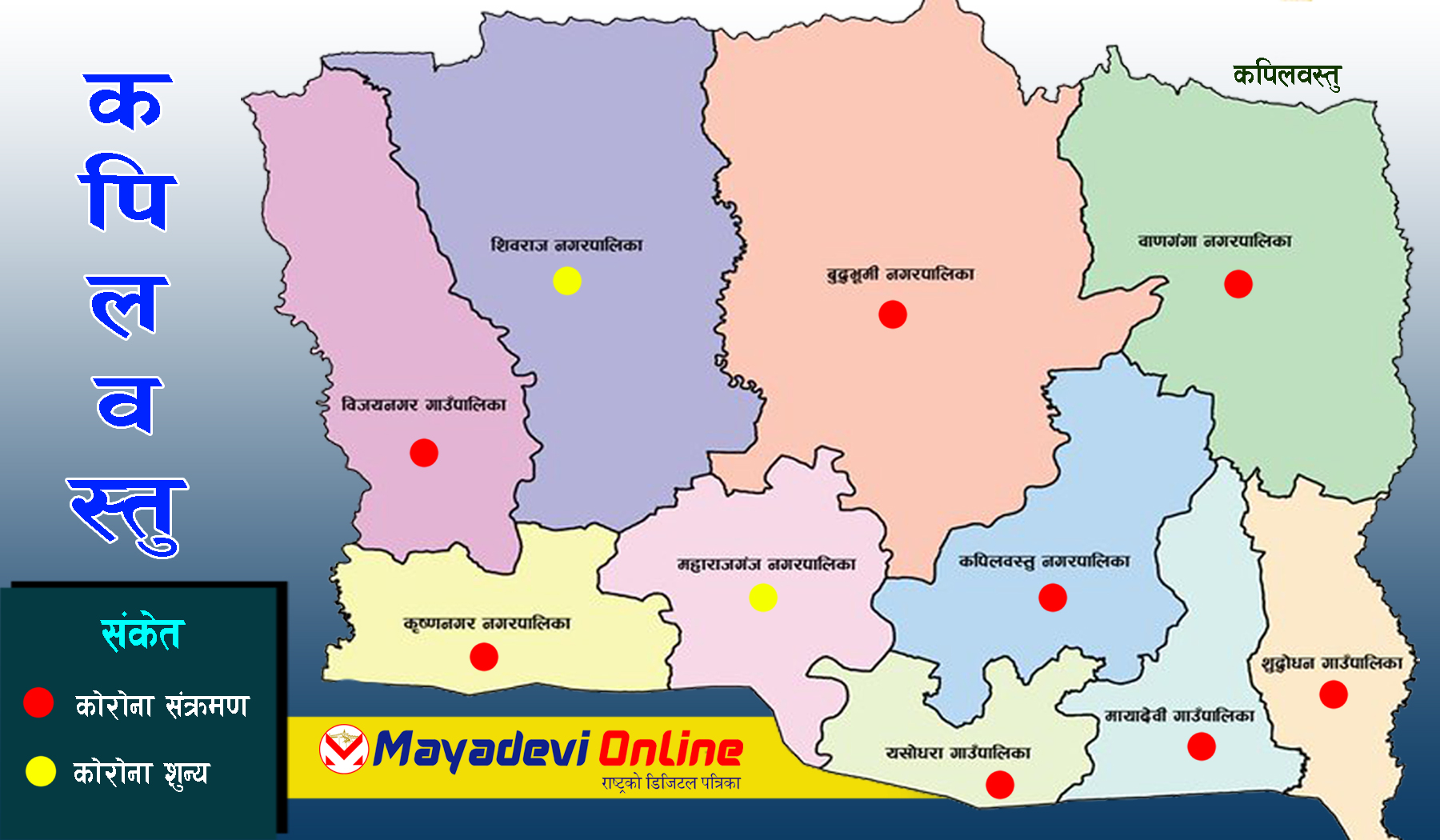 जिल्लामा यसभन्दा अगाडी कपिलवस्तु नगरपालिका, बुद्धभूमि नगरपालिका, मायादेवी गाउँपालिका, यशोधरा गाउँपालिका, शुद्धोधन गाउँपालिका कोरोनाबाट संक्रमित भैसकेका छन् । हाल जिल्लामा कोरोनाको संख्या ४० पुगेको छ । गत विहीबारबाट देखिन थालेको कोरोना संक्रमण आजको बिहीबारसम्म आईपुग्दा ४० पुगेको हो ।