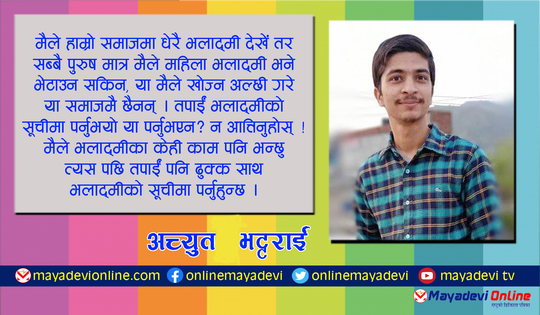 के तपाईं भलाद्मी हो ? यसो सोच्नुस् त, तपाईं भलादमी बन्न के के प्रयास गर्नुभएन । सानोमा तपाईं चकचक गर्दा बा आमाले भन्नुभए होला, अलि भलाद्मी भएर बस । अलि ठूलो भएर तपाईंले फाटेको कपडा लगाउँदा भन्नुभएको होला, छि कस्ता कपडा लाको, अलि भलाद्मीले लगाउने जस्ता लगा न । भलाद्मीले पनि यस्ता कपडा लगाउँछन् र । फेरि चिटिक्क परेका र स्त्री लगाएर कपडा लगाउँदा भन्नुभएको होला बल्ल भलाद्मी जस्तो देखिस्, अब आफै सोच्नुस् त तपाईं अचानक आफ्नो ‘क्रस’ लाई देख्नुभयो तपाईं अलि फरक व्यवहार गर्नुहुन्छ होला ता की सोचुस उसले पनि कस्तो भलाद्मी रैछ ।