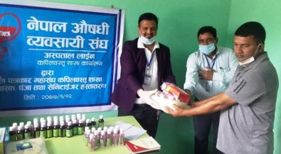 मायादेवी अनलाइन, तौलिहवा । नेपाल औषधी ब्यवसायी संघ कपिलवस्तुले कपिलवस्तुका संचारकर्मीलाई मास्क, सेनिटाईजर र पन्जा
