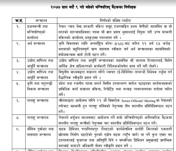 मन्त्रिपरिषद्को मंगलबार बसेको बैठकका निर्णयहरु सार्वजनिक भएको छ । २२ निर्णयहरु अर्थ तथा सञ्चारमन्त्री डा. युवराज खतिवडाले बिहीबार सार्वजनिक गरेका हुन् । मन्त्रिपरिषदले बढुवादेखि कर्मचारीको सरुवा तथा विभिन्न नीतिगत निर्णयहरु गरेको छ ।