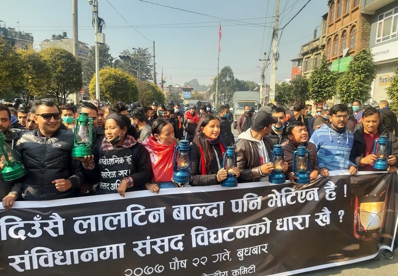 नेपाल कम्युनिस्ट पार्टी नेकपा प्रचण्ड–माधव पक्षका विद्यार्थीले काठमाडौँमा प्रदर्शन गरेका छन्। प्रधानमन्त्री ओलीले पुस ५ गते संसद् विघटन गरेपछि प्रचण्ड–माधव पक्षका अनेराश्ववियूको केन्द्रीय कमिटीले विरोध प्रदर्शन गरेका हुन्। विद्यार्थीले दिउँसै लालटिन बाल्दा पनि भेटिएन है, संविधानमा संसद विघटनको धारा खै ? भन्दै सडकमा निस्किएका हुन्। विद्यार्थीले काठमाडौंको माइतिघरमा दिउसै लालटिन बालेर प्रदर्शन गरेका हुन्।