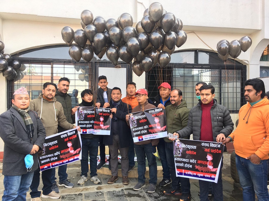 राष्ट्रिय युवा संघ नेपालले आज प्रतिनिधिसभा विघटनविरुद्ध कालो बेलुन उडाएर विरोध गरेको छ। पार्टी केन्द्रीय कार्यालय पेरिसडाडामा युवा संघले कालो बेलुनमा ब्यानर झुण्डाएर बेलुन उडाएको हो।