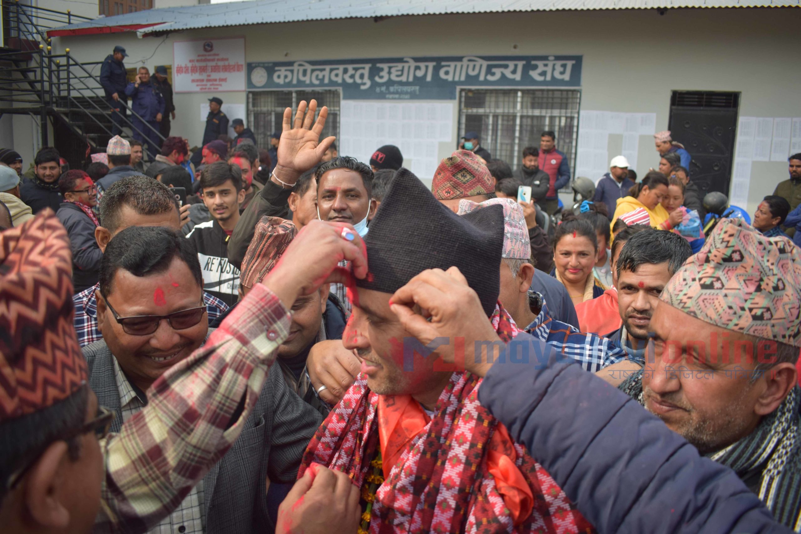 कपिलवस्तु उद्योग वाणिज्य संघका नव निर्वाचित अध्यक्ष डोलकराम घिमिरेले आफुलाई मतदान गर्ने सम्पूर्ण मतदातालाई धन्यवाद दिनुभएको छ ।