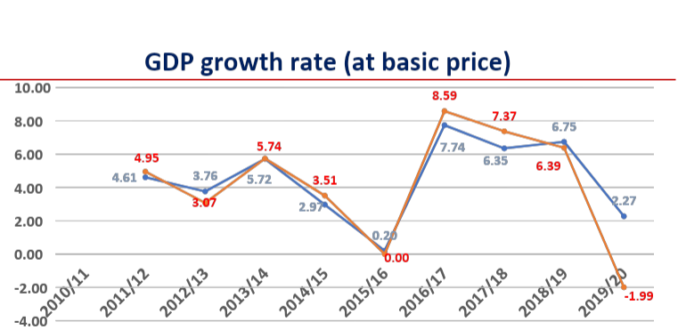 चालु आर्थिक वर्षको पहिलो त्रैमासको आर्थिक वृद्धिदर पनि ४ दशमलव ६ प्रतिशतले ऋणात्मक रहेको केन्द्रीय तथ्याङ्क विभागले उल्लेख गरेको छ । तर २०७२ सालको भूकम्प र नाकाबन्दीपछि पनि नेपालको आर्थिक वृद्धिदर ० दशमलव २ प्रतिशत रहेको थियो । केन्द्रीय तथ्याङ्क विभागको पछिल्लो संशोधित तथ्याङ्कले नेपाली अर्थतन्त्र कोरोना महामारीका कारण ऋणात्मक आर्थिक वृद्धिदर हुने देशको सूचीमा परेको छ ।