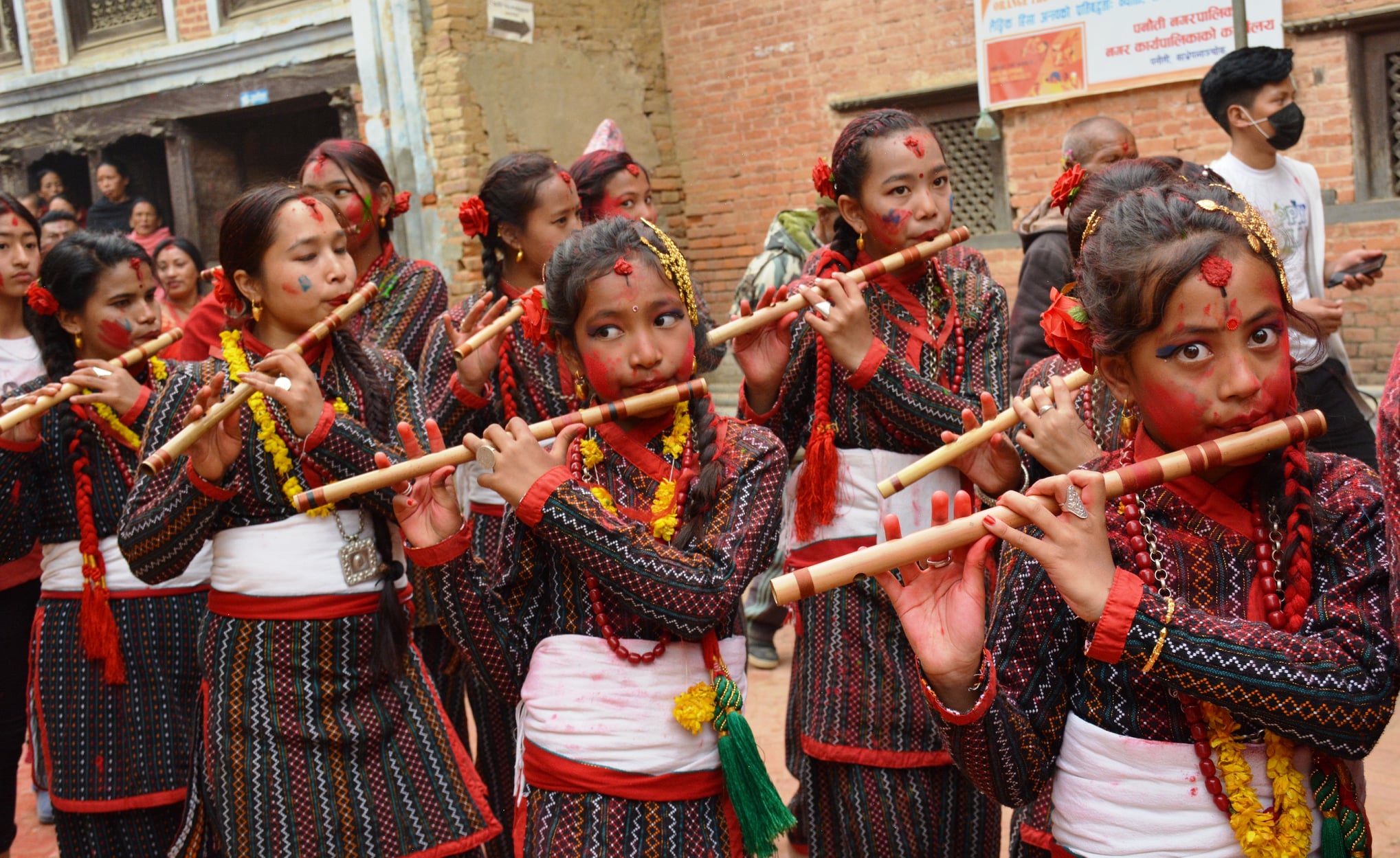 काभ्रेको पनौती नगरपालिका वडा ९ को सङ्कटा माई मन्दिर परिसरमा बाँसुरी बजाइँदै। तस्वीरः पेमा लामा, रासस