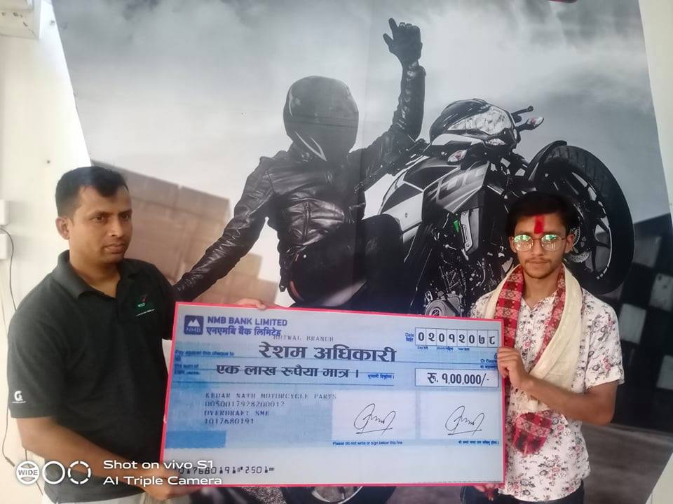 कपिलवस्तुको केदारनाथ मोटरसाइकल पार्टस (बजाज शोरुम) वैरियाबाट बजाज मोटरसाइकल खरिद गर्दा रुपन्देहीको सैनामैना नगरपालिकाका रेशम अधिकारी १ लाख विजेता बन्न सफल भएका छन् । बजाजको नयाँ बर्ष अफर अन्तर्गत शुन्य अफरमध्येबाट रेशम १ लाख विजेता बनेका हुन् ।