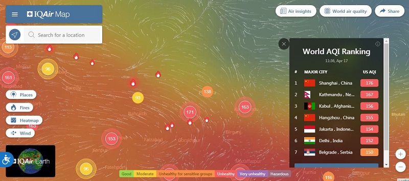 वातावरण प्रदूषणको मात्रा मापन गर्ने सूचक एक्यूआईले अहिले पनि काठमाण्डौ प्रदूषित ९४ सहरमध्ये शीर्ष दुईमा देखाएको छ ।