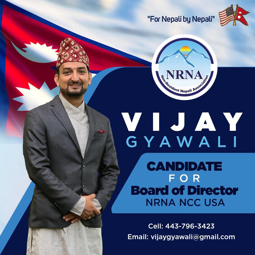 तर अहिलेसम्म नेपालीको पक्षमा दरिलो ढंगबाट अमेरिकामा आवाज नउठाइँदा कति नेपालीले त्यहाँ दुख पाउनु परेको छ । त्यसकारण पनि यो चुनाव अमेरिकामा बसोबास गरिरहेका नागरिकको लागि निकै महत्वपूर्ण छ । अध्यक्ष लगायतमा बिभिन्न पदमा बिभिन्न ब्यक्तिको उम्मेदवारी परिरहँदा निकै महत्वपूर्ण पद ‘बोर्ड अफ डाइरेक्टर’ को पदमा लुम्बिनी प्रदेश गुल्मीका एक जना होनहार युवा विजय ज्ञवालीले पनि उम्मेदवारी दिएका छन् । उनी को हुन् र उनलाई किन जिताउने ? उनको जीवनीमा एकै छिन् भ्रमण गरौँ ।
