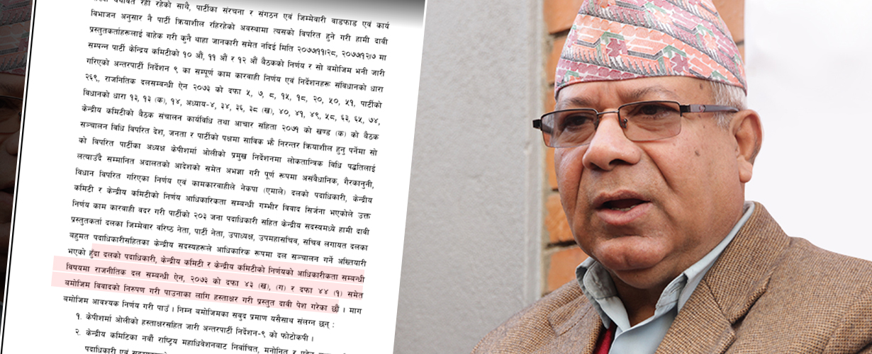 पार्टी अध्यक्ष ओलीको निर्देशनमा अदालतको आदेशको समेत अवज्ञा गरी अवैधानिक, गैरकानूनी र विधान विपरित निर्णय गरेको र यसले एमालेको पदाधिकारी, केन्द्रीय कमिटी र केन्द्रीय कमिटीको निर्णय अधिकारितामा गम्भीर विवाद सृजना भएको भन्दै नेपाल समूहले भनेको छ, ‘उक्त निर्णय काम कारबाही वदर गरी पार्टीको २०३ जना पदाधिकारीसहित केन्द्रीय सदस्य समेत हामी दाबी प्रस्तुत गर्दा दलका जिम्मेवार वरिष्ठ नेता पार्टी नेता, उपाध्यक्ष, उपमहासचिव, सचिपव लगायत दलका बहुमत पदाधिकारीसहित केन्द्रीय सदस्यहरुले आधिकारिक रुपमा दल सञ्चालन गर्ने अख्तियारी भएको हुँदा दलको पदाधिकारी केन्द्रीय कमिटी र केन्द्रीय कमिटीको निर्णयको आधिकारिकता सम्बन्धी विषय राजनीतिक दलसम्बन्धी ऐन, २०७३ को दफा ४३ ९ख०, ९ग० र दफा ४४ ९१० समेत बमोजिम विवादको निरुपण गरी पाउनका लागि हस्ताक्षर गरी प्रस्तुत दाबी पेश गरेका छौं ।’