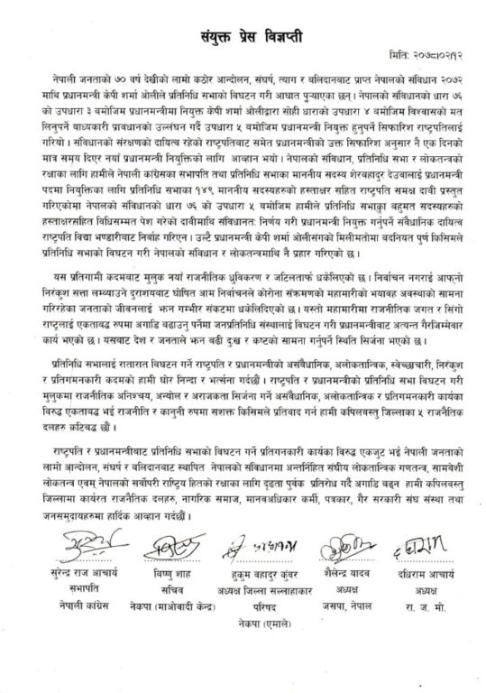 नेपाली कांग्रेसका सभापति सुरेन्द्रराज आचार्य, नेकपा (माओवादी केन्द्र)का सचिव विष्णु शाह, नेकपा एमालेका जिल्ला सल्लाहकार परिषद अध्यक्ष हुकुम बहादुर कुँवर, जसपा नेपालका अध्यक्ष शैलेन्द्र यादव, राष्ट्रिय जनमोर्चाका अध्यक्ष दधिराम आचार्यद्वारा हस्ताक्षरित विज्ञप्तिमा संविधानको संरक्षणको दायित्व रहेको राष्ट्रपतिबाट समेत प्रधानमन्त्रीको उक्त सिफारिश अनुसार नै एक दिनको मात्र समय दिएर नयाँ प्रधानमन्त्री नियुक्तिको लागि आव्हान भएको विज्ञप्तीमा उल्लेख छ ।