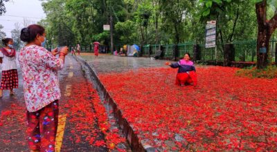 पोखरा महानगरपालिका–६ फिस्टेल अगाडि भुइँमा झरेको गुलमोहर फूलसँग तस्वीर खिच्दै महिला ।तस्वीरः राधिका कँडेल, रासस